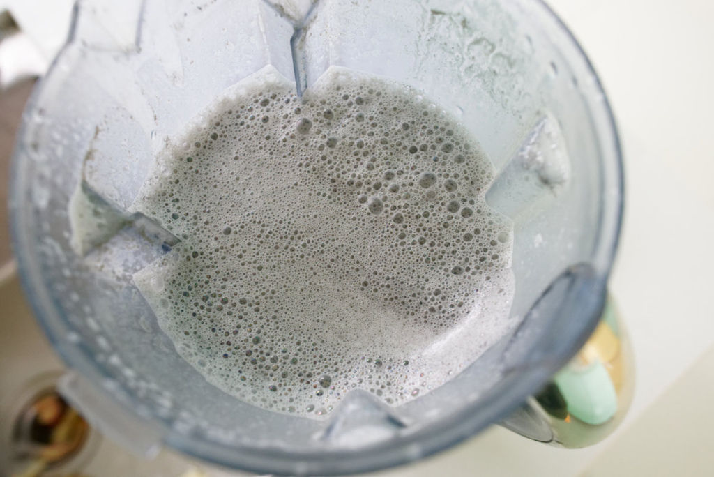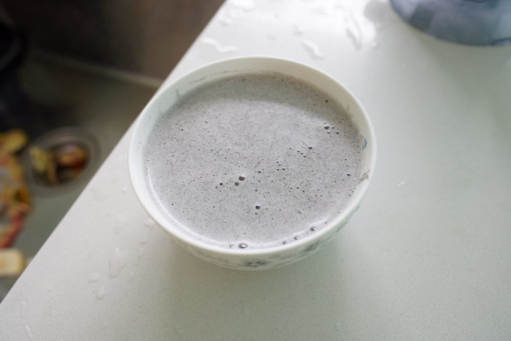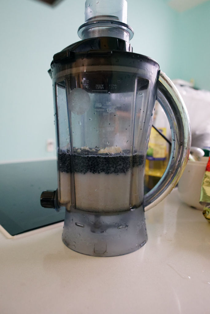 - 使用「瞬轉」多次,一開始可以看到黑芝麻的破碎顆粒,直到完全看不到,加上第二次的水,到800cc。