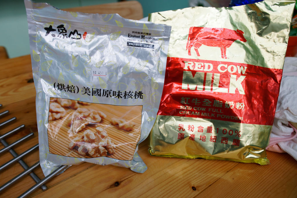 上圖:大象山的核桃,紅牛全脂奶粉。