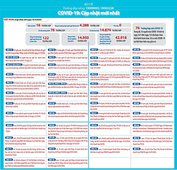 3月16日,越南衛生部共確認61例COVID-19病例。最新的案件是兩個越南人和一個法國國民。